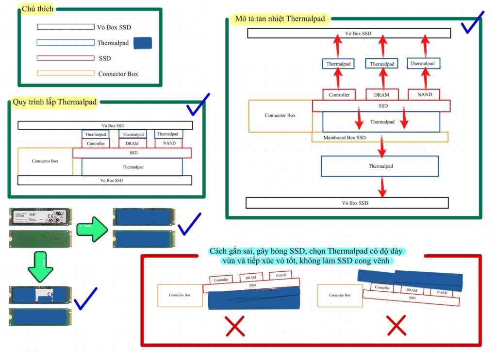 Hướng dẫn chi tiết quy trình lắp Thermal Pad cho SSD enclosure (Box SSD) chuẩn nhất: cách chọn độ dày Thermal Pad, dán hai mặt SSD, tránh làm SSD cong vênh. Minh họa rõ ràng cách đi của nhiệt từ chip SSD đến vỏ Box, giúp duy trì tốc độ cao và tránh ngắt kết nối.